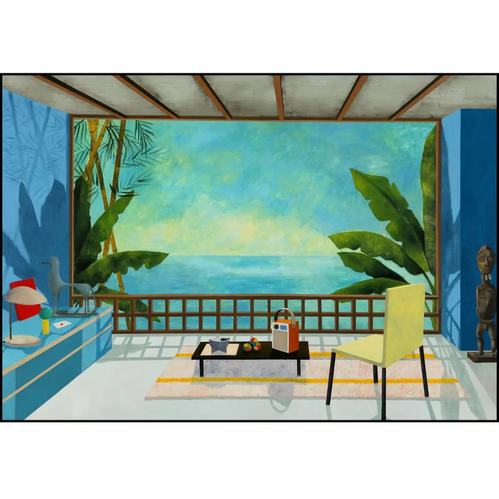 "Le chant de l'aube" è un dipinto recente e di grandi dimensioni di Mickaël Doucet, realizzato nel 2020 con la tecnica olio su tela, misurando 114 x 162 cm Come la sua opera "Moderato Cantabile", anche questa esplora la rappresentazione di spazi interni e paesaggi filtrati, tipici della sua produzione.